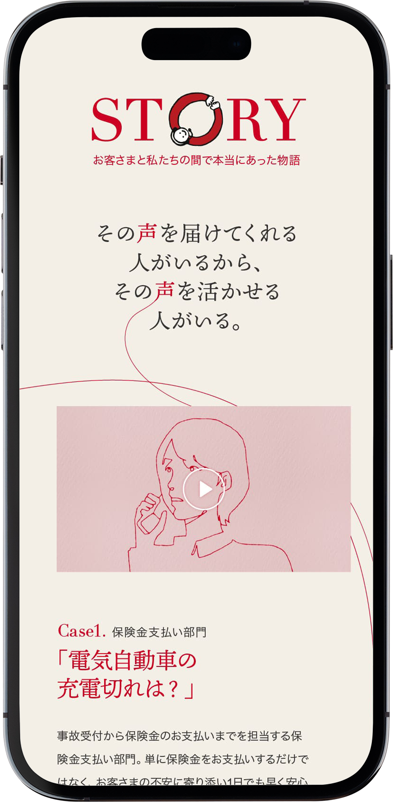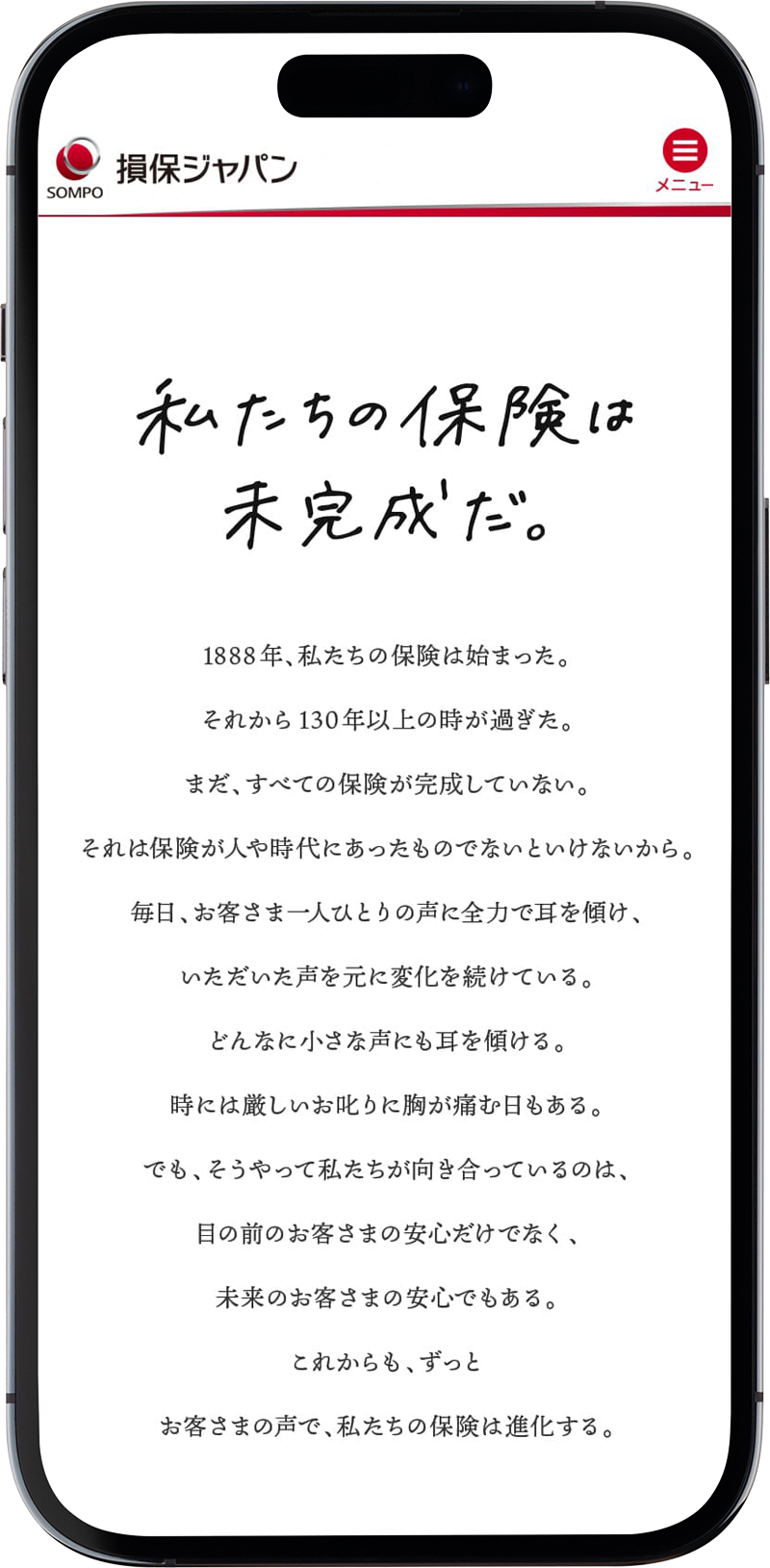 CLIENT:損害保険ジャパン株式会社 担当領域:Art Direction、Web Direction、Design、Illustration、Coding 制作媒体:新聞広告・WEB(PC&スマホ) URL:https://www.sompo-japan.jp/company/customervoice/