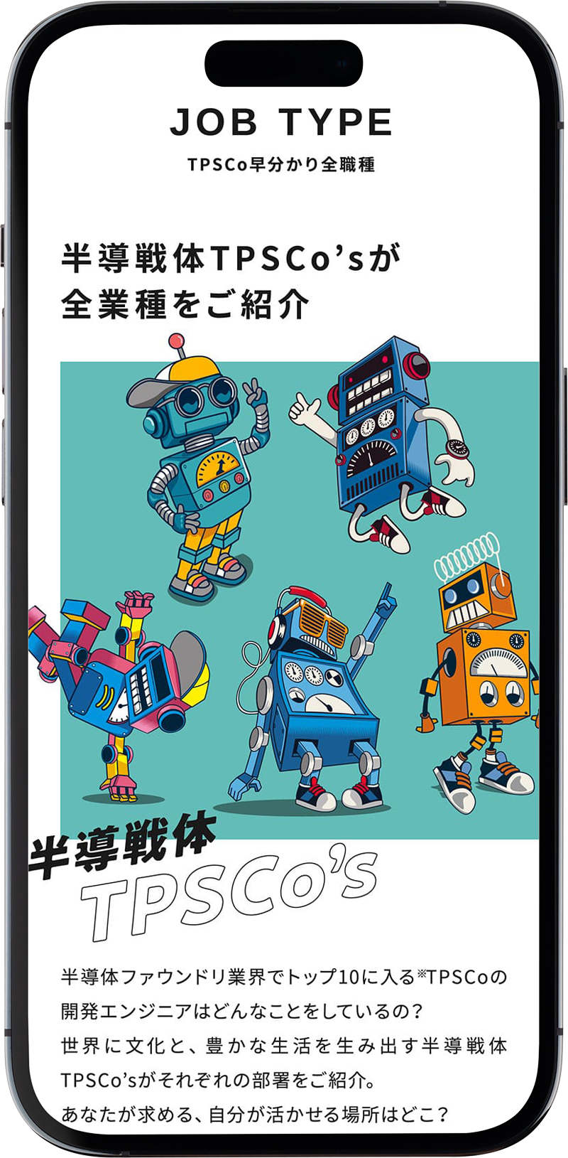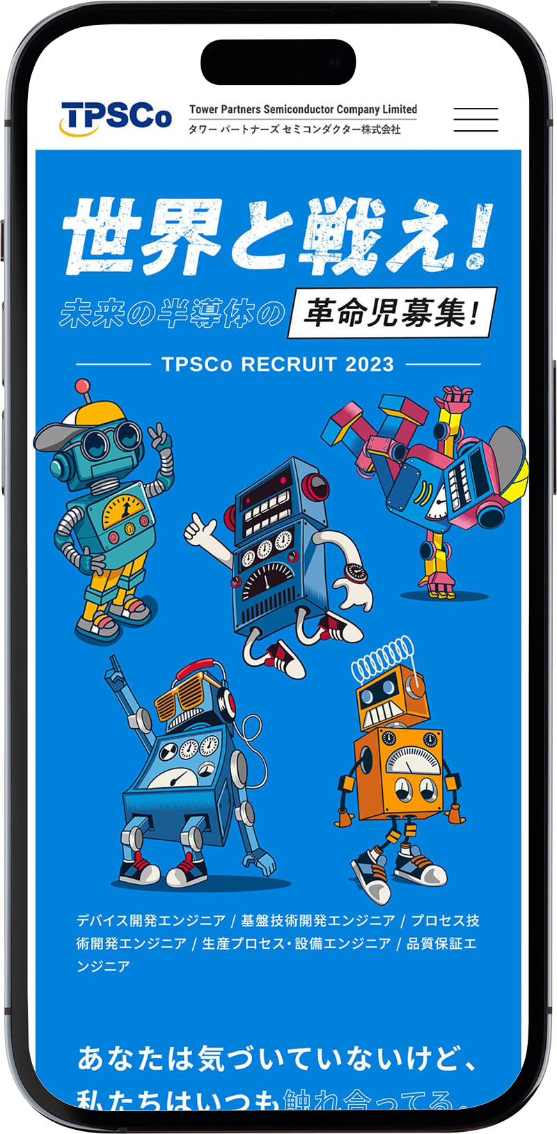 CLIENT:タワー パートナーズ セミコンダクター株式会社 担当領域:Art Direction、Web Direction、Design 制作媒体:WEB(PC&スマホ)/ リクルートサイト URL:https://www.jp-tpsco.com/